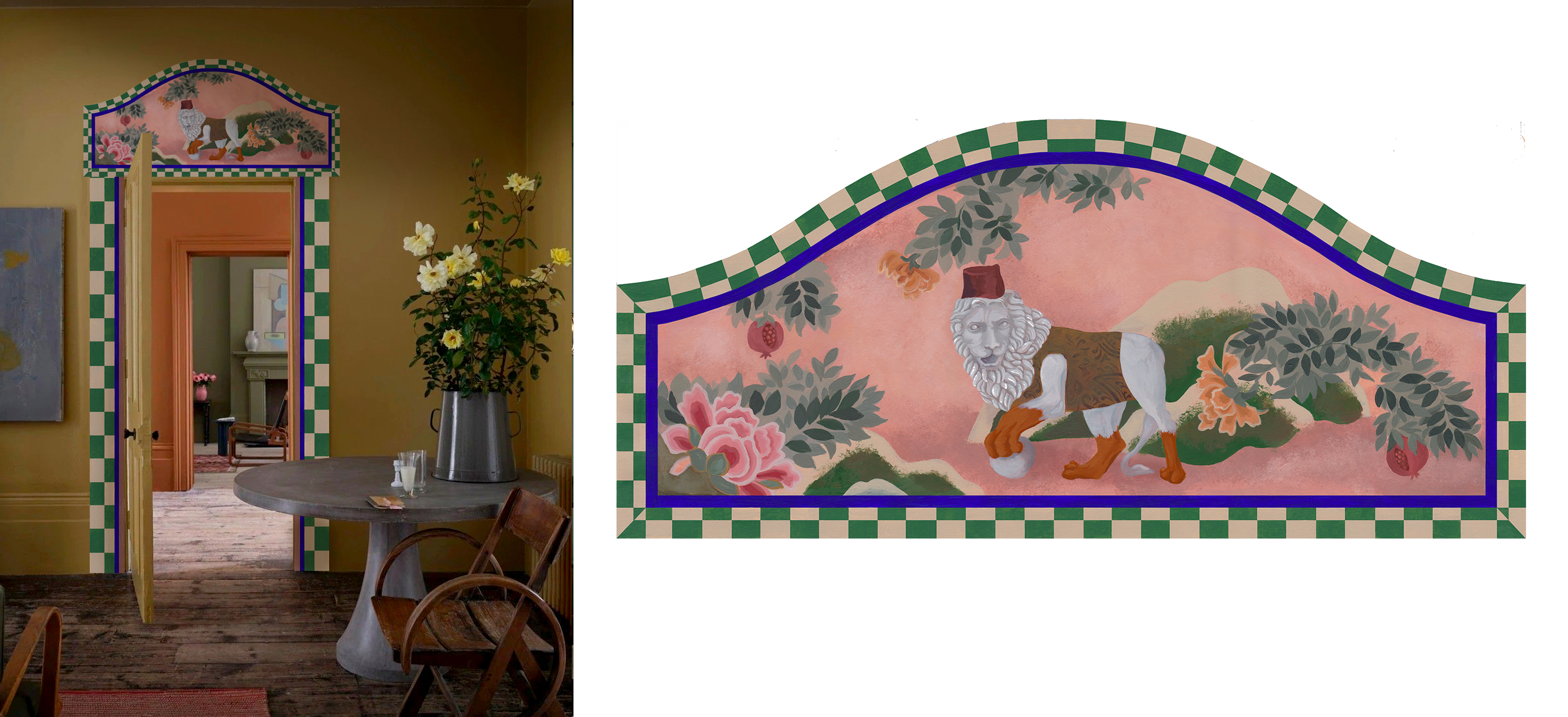 La Sentinelle is a decorative motif designed as a door pediment printed on wallpaper.