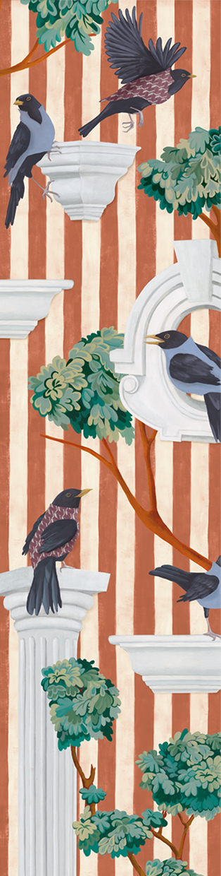 La collection RAMAGE est une ode au printemps… un doux mélange entre des foisonnantes Verdures de Tapisseries Flamandes, en harmonie avec des motifs géométriques et des vestiges d’éléments architecturaux, qui nous projetent dans un jardin onirique et décalé.